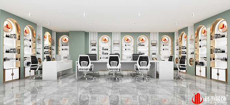 這次美業(yè)紋飾案例中使用的是時下流行的潮流元素,結(jié)合該行業(yè)是接觸時尚前端的行業(yè),也是一個能夠突出美的行業(yè),對此設(shè)計團隊使用莫蘭迪色系來作為展廳空間的主色調(diào),強調(diào)時尚元素的同時,還能夠讓空間增加更多的設(shè)計感。利用吊飾吊燈來作為空間的點睛之筆,空間感強烈的同時,還能夠讓空間的層次感更加突出。
