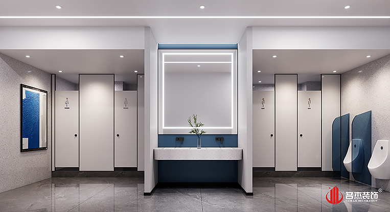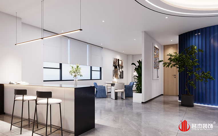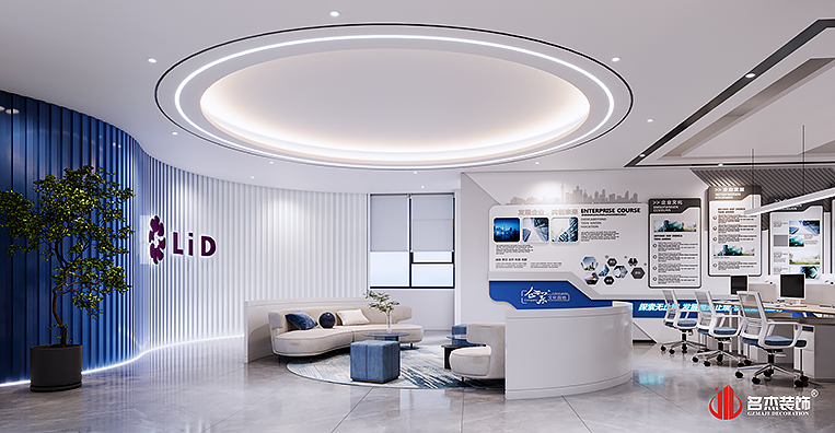整個辦公裝修設計空間是以時尚簡約的風格來作為主打風格的,加入企業LOGO色——藍色,作為貫穿整個辦公裝修設計空間的點綴色。前廳的背景墻使用的是一種漸變的手法,讓辦公裝修設計空間變得更有設計感,同時在前廳的吊頂使用圓弧的元素,讓辦公裝修設計空間變得更加有層次感。