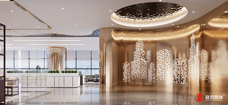 整個辦公空間使用土豪金的配色作為主調(diào)色,加入土豪金配色能夠讓辦公室裝修設計空間變得更有奢華的感覺,更能夠體現(xiàn)出新能源這個行業(yè)的發(fā)展是非常有前景的。前臺區(qū)域使用鋁材沖孔板作為背景墻,加入土豪金的顏色,一下子就能夠讓人感受到這個空間奢華感。在茶室區(qū)域使用弧形玻璃,搭配有造型的天花,設計感一下子就出來了。
